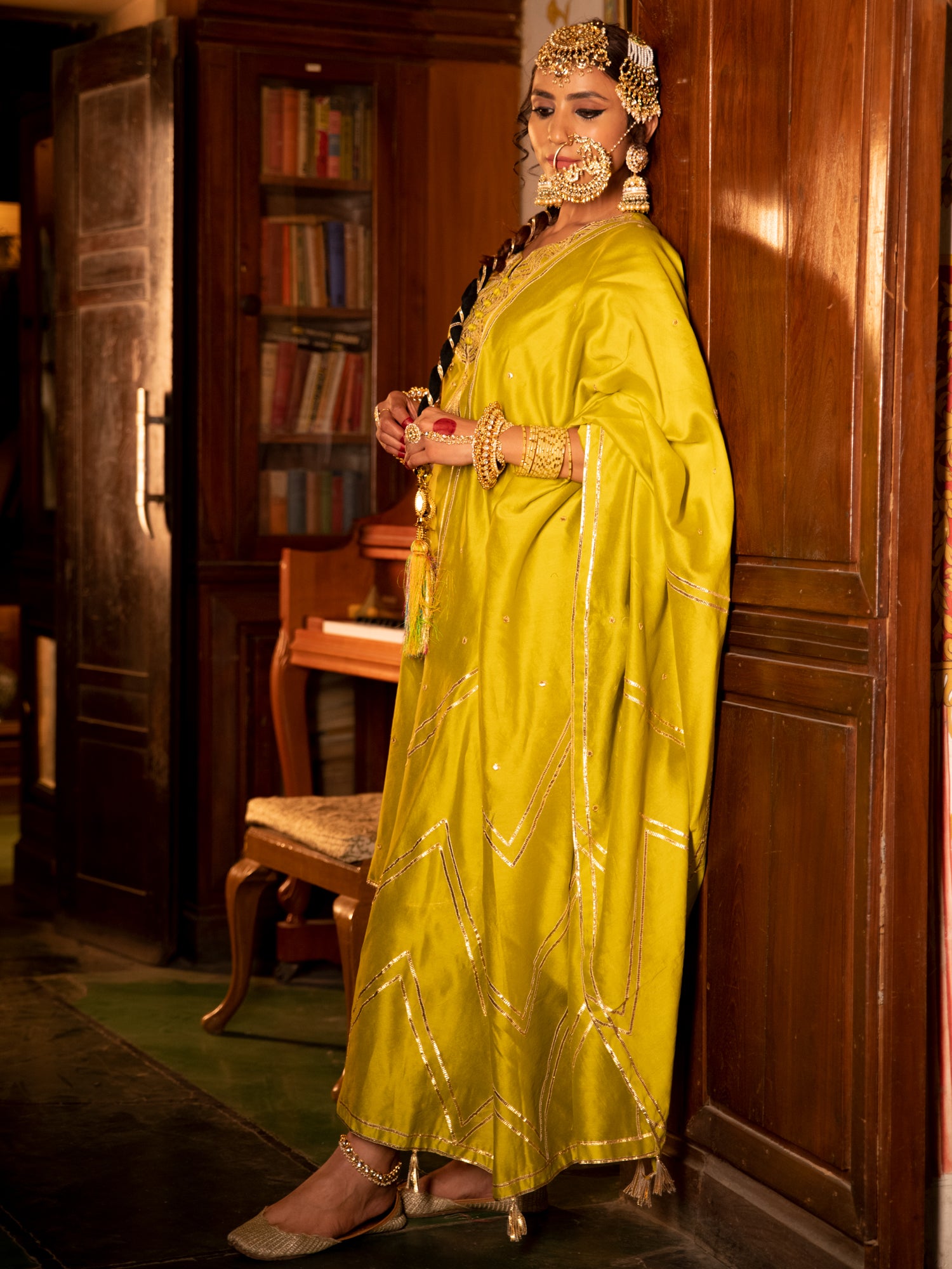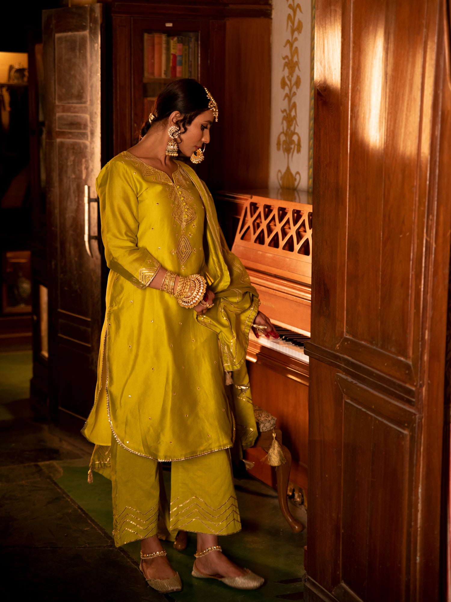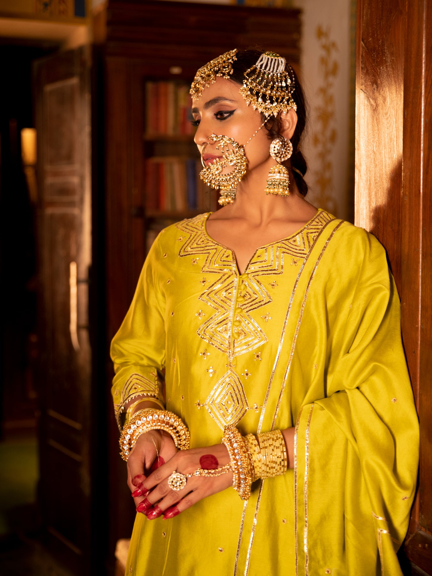 KURTA: A green chanderi silk kurta is detailed with gold gota embroidery.